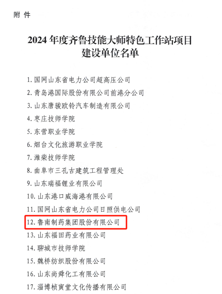 近日,山東省人力資源和社會(huì)保障廳發(fā)布《關(guān)于公布2024年度齊魯技能大師特色工作站項(xiàng)目建設(shè)單位的通知》,魯南制藥集團(tuán)股份有限公司獲批齊魯技能大師特色工作站。