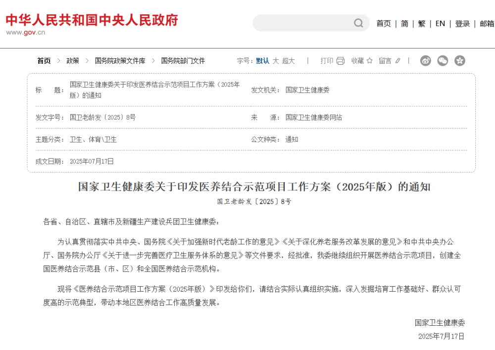 近日,國家衛(wèi)生健康委印發(fā)《醫(yī)養(yǎng)結(jié)合示范項目工作方案(2025年版)》,明確提出通過創(chuàng)建全國醫(yī)養(yǎng)結(jié)合示范縣(市、區(qū))和示范機構(gòu),推動形成 “防-治-康-養(yǎng)” 一體化服務(wù)模式,這為功能醫(yī)學(xué)設(shè)備在醫(yī)養(yǎng)結(jié)合場景的深度應(yīng)用提供了政策指引。