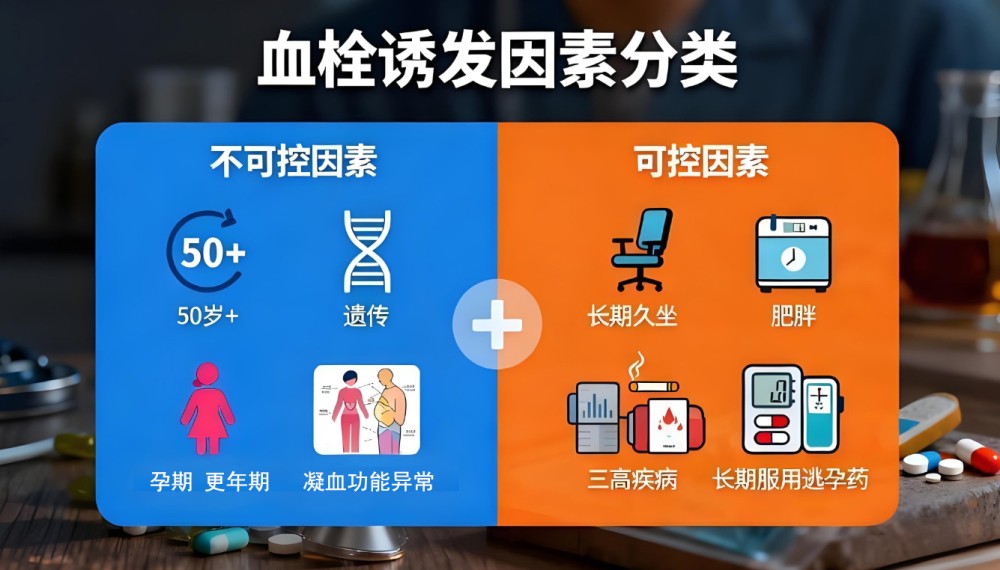 不可控因素:年齡(50歲后血栓風(fēng)險(xiǎn)顯著升高)、遺傳(如凝血功能異常遺傳?。?、性別(女性孕期、更年期激素變化會(huì)增加風(fēng)險(xiǎn));